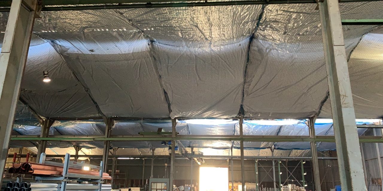 Die Decke dieser älteren Industriehalle besteht teilweise noch aus Asbest. Die Beauftragung bestand darin, dass die Anbringung der Netze mit Plane die Mitarbeiter vor eventuell herabfallenden Teilen schützt.